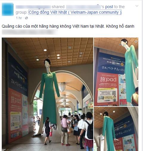 Cách đây vài giờ, một người dùng facebook chia sẻ một số hình ảnh với chú thích: "Quảng cáo của một hãng hàng không Việt Nam tại Nhật!". Hình ảnh được chia sẻ là một búp bê ma-nơ-canh khổng lồ có dáng đứng kỳ quặc, đang mặc đồng phục tiếp viên nữ của hãng hàng không Vietnam Airlines.