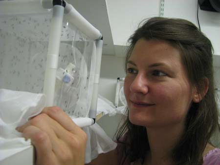 Một nhà khoa học ở Công ty Oxitec bên cạnh muỗi biến đổi gene (Ảnh: Oxitec)