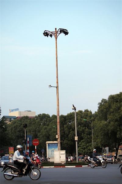 Camera của công an (hình chữ nhật, gắn trên cao) và của VOV (hình tròn, cột thấp) đặt cạnh nhau tại ngã tư Nguyễn Chí Thanh - La Thành, nơi được cho là Nguyễn Mạnh Tường đi qua khi phi tang theo lời khai ban đầu của Tường