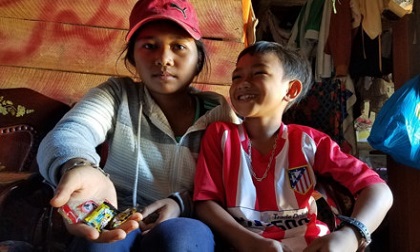 Bên cạnh đó, trên đường qua xã Ea Yiêng, nhóm chị Quỳnh còn phát bánh kẹo cho các em học sinh phần quà gồm bánh quy, bánh kẹp, kẹo mè, kẹo sữa và xí muội.