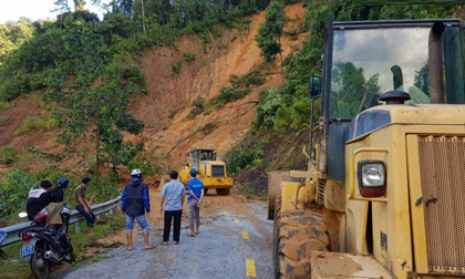 Lực lượng chức năng cùng phương tiện đang mở đường tiếp cận 2 vụ sạt lở núi nghiêm trọng