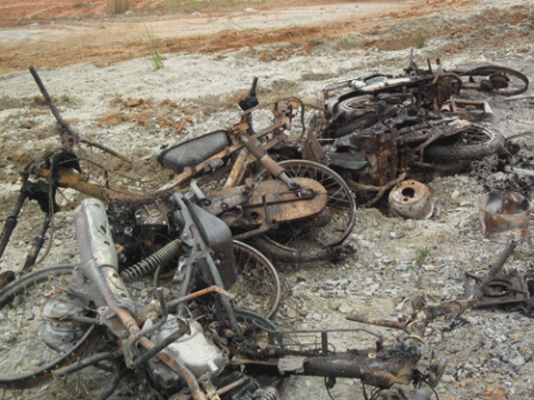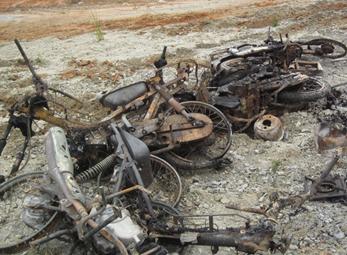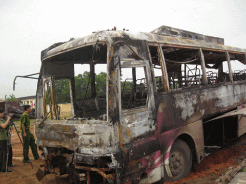 Sau khi đâm đầu vào xe khách, xe máy do hai thanh niên điều khiển phát cháy làm cháy lan. Hậu quả, xe khách, 4 chiếc xe máy để trong xe khách cùng nhiều đồ đạc của 52 hành khách cháy rụi.