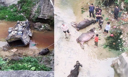 Tài xế điều khiển chiếc xe tải bất ngờ mất lái tông đổ lan can cầu và lao xuống suối. Vụ việc khiến tài xế bị thương ở tay nhưng nhiều con trâu chết la liệt dưới suối khiến nhiều người ám ảnh.