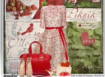 Bây giờ đây cũng váy voan họa tiết cherry đỏ tươi tắn, nàng thêm nét sang trọng bằng giày cao gót màu be, giày cao gót sẽ tôn thêm sự nữ tính dịu dàng của chiếc váy voan dài quá gối. Túi da bóng đỏ rực rỡ tiệp với màu dây lưng, nét ngây thơ nhường chỗ cho sự quyến rũ và tự tin. Nhưng vẫn tung tăng, vẫn rạng rỡ không phải nơi vườn dâu xanh ngát mà giữa phố phường và mỉm cười với những ánh nhìn ngoái lại.
