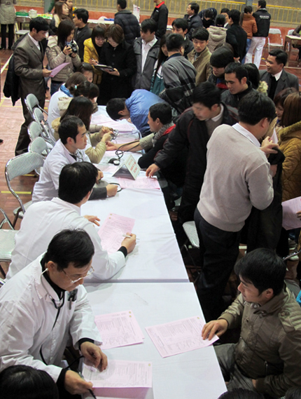Các y, bác sĩ Bệnh viện thành phố Yên Bái kiểm tra sức khỏe những người tham gia hiến máu